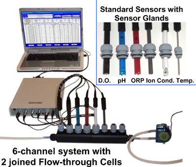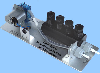 The modular design Flow-through cell blocks can be joined to hold up to 12 electrodes or sensors. The Flow-through cell (s) and the Peristaltic Pump can be mounted on the bench top or rack Power supplier for the the peristaltic pump is 12V DC Power supplier for the the sensor electronic depends on the selected type of Analyser/Monitor The data cable between the computer to the sensor electronic should not be longer than 20 meter |